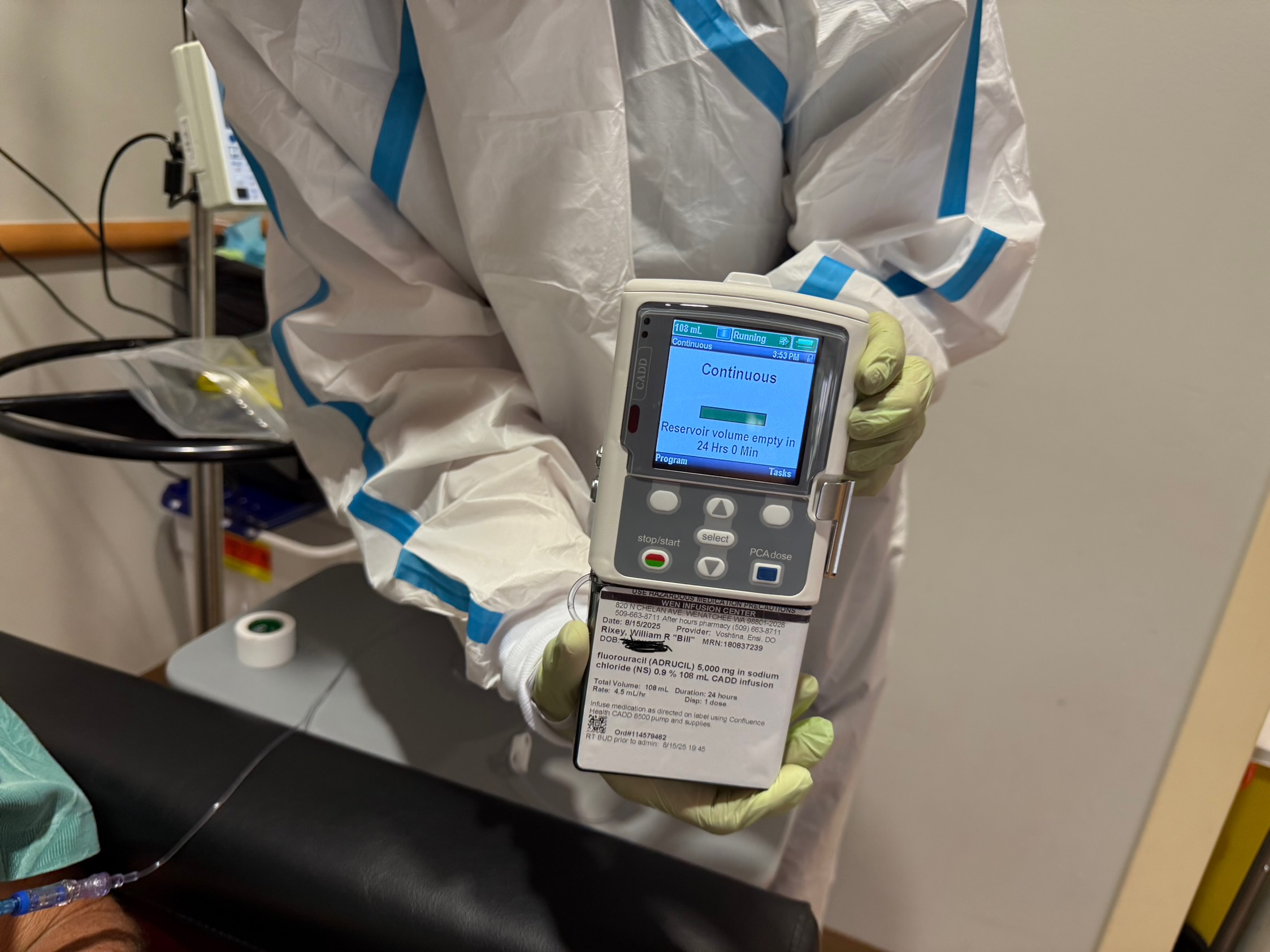 August 15, 11:30 am, round 3. Today’s nurse was Kendall. Round 3 finished at 3:45 pm and home we went with the “hummer” (pump). He’ll go back at 4 pm tomorrow for shot of Zarxio and get the pump removed from the port. Then again on Sunday and Monday at 4 pm he’ll get a shot of Zarxio (this helps to keep the WBC count up). His weight was down about 4 pounds from last time probably because nothing tastes good now. He says everything pretty much tastes like cardboard (not that he eats a lot of cardboard but you know). The effects of chemo are cumulative so I guess it will get worse before it gets better no doubt.