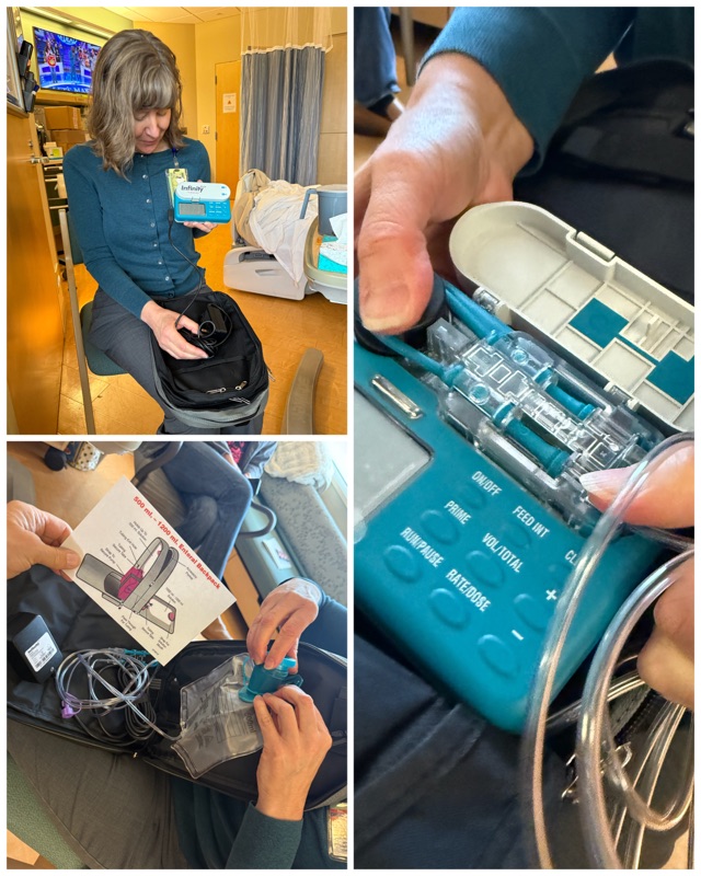 The dietician, Melinda Johnson, came in around 9 to train us on how to use the Infinity external feeding pump and portable backpack.
