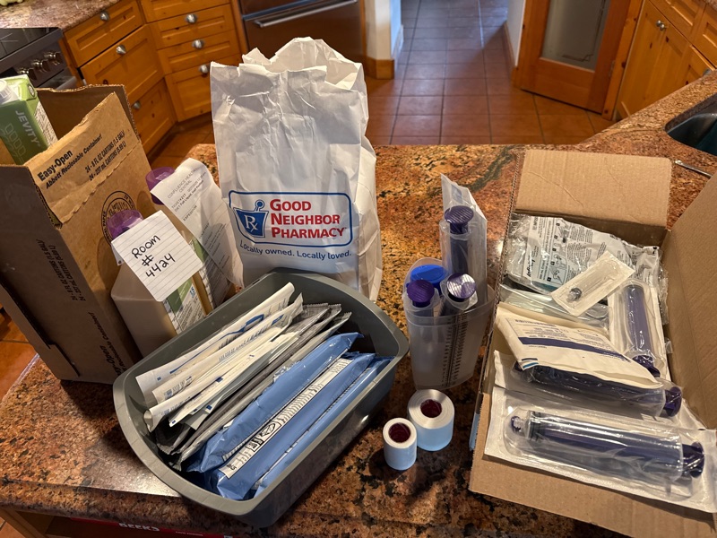 He has a long list of drugs that he has to continue to take at home until we meet with then surgeon again. In order to get out, we needed to have the drugs and final sign out. I had to go down to the pharmacy 3 times to get his ginormous bag of prescriptions to take home with us. Finally they had it done at 3pm and they gave Willie a ride to the curb in a wheelchair per hospital protocol. He only has one tube anttached now (feeding) so freedom. Also we have a 2 week supply of “food” for the tube and a whole bunch of gauzes, tape, gauze, syringes and more. He will be using the Infinity feeding tube for a month or two to get his nutrition It’s not forever, but he’ll need it until he can eat normally. His new normal will be small meals 6 times a day vs 3 big meals That should work well for him since he’s a snacker anyway And he has to go through 4 more rounds of chemo soon so this system will actually be a benefit at this point