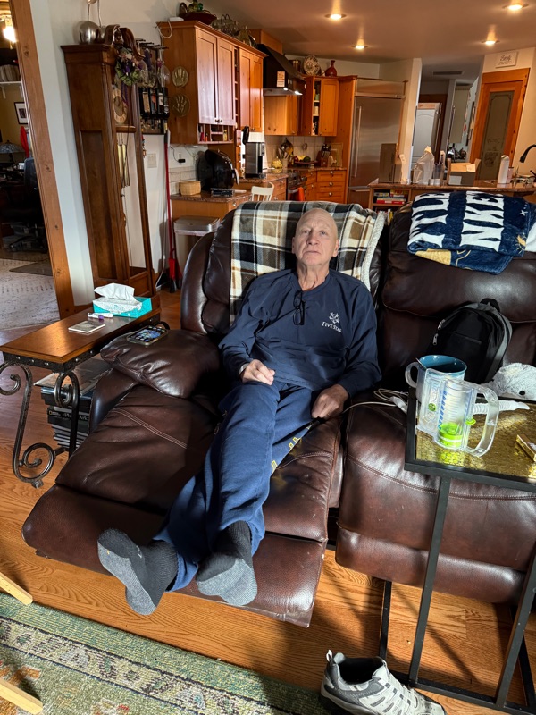 I’ll just summarize today by saying that it’s so nice to be home. We both got showers. Willie had his first since last Tuesday (10/21) morning before surgery. And me, my first time home since an hour last Sunday am. Sam brought home food from Peking for us. I cooked up some bone broth for Willie and we both had ice cream for desert. Dr Loewen said eating is just “recreational” right now. Most of his nutrition will come from the feeding tube, 2000 calories a day. But he’ll need to fit in liquids to stretch out his esophagus and keep it moist. He’s had a very very hoarse voice since the surgery and is hard to hear. This was caused by the nose tube ans also intubation during the”e 5 hour surgery. Apparently this is common annd they say his voice should eventually improve to normal. All in all, a very busy and good day. There really is no place like home!! ❤️