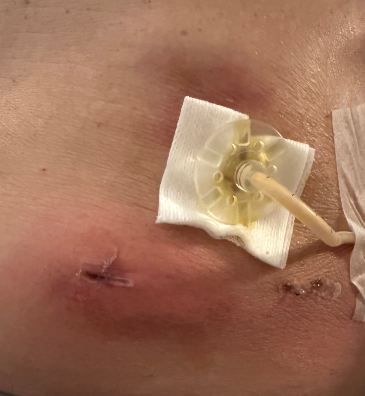 Leaky painful incision area and J-tube where food goes in 50ml hour 22 hours a day, 2 hours off