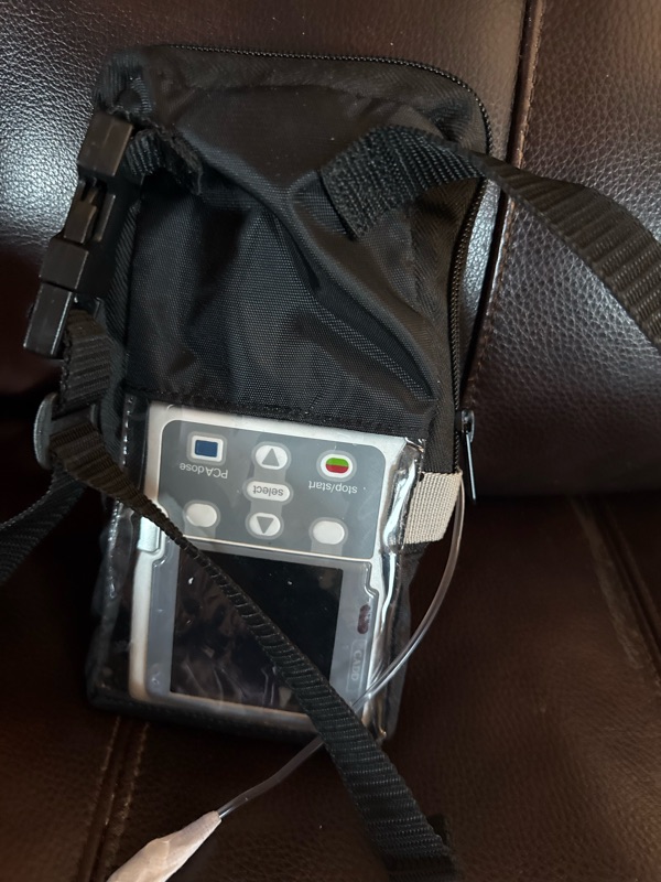 Putting this picture in of the pump he brings home after each round of chemo. He has to keep this on for 24 hours and go back next day to get it removed from the port. He hates carrying around all the attachments. It’s annoying and inconvenient.