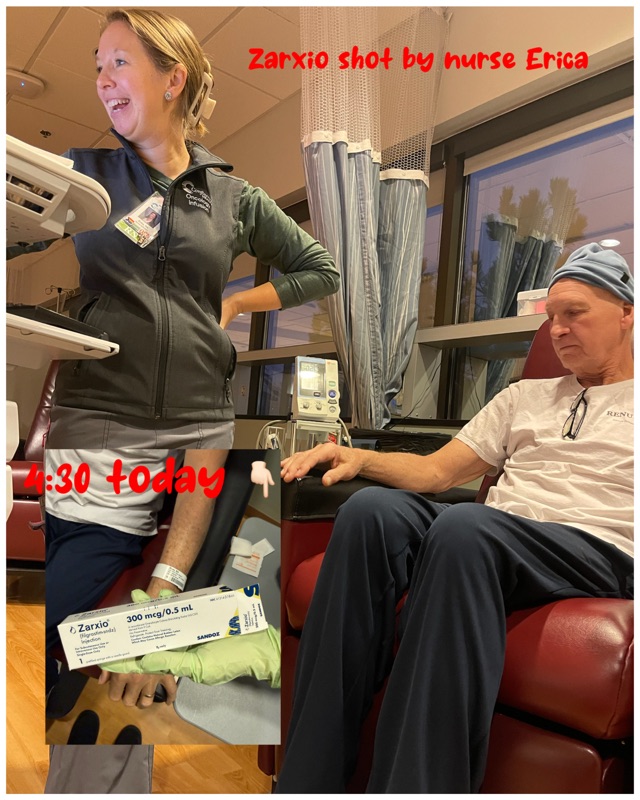 Today he went in for third (one per day for 3 days after chemo), and last for this round, of Zarxio. This shot helps to keep his white blood counts up which will help to fight infection and disease. His WBC count during the first few rounds dropped dangerously low and this wonder drug is a good fix for that.